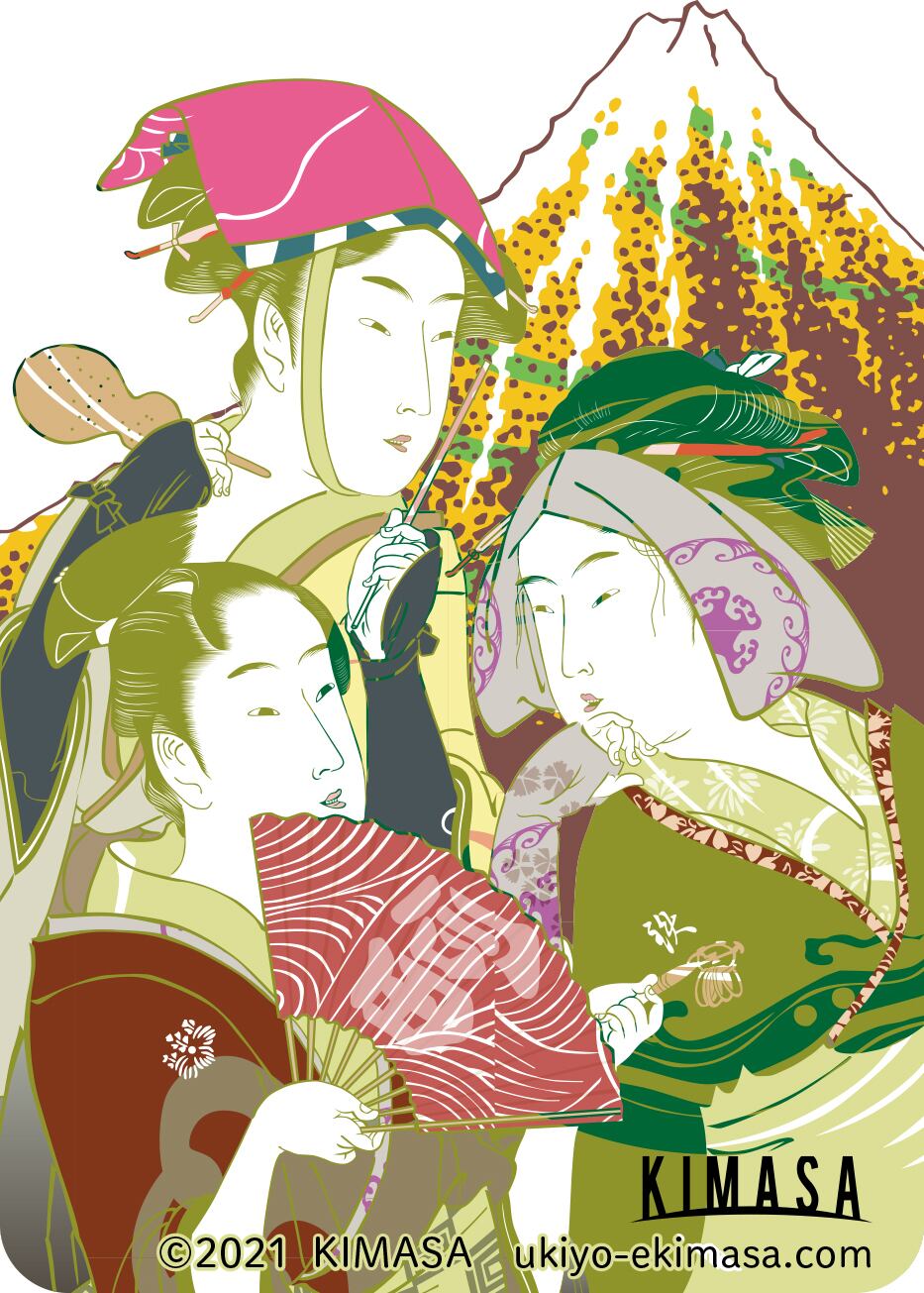 限定10個生産 喜多川歌麿の美人画と富士山をコラージュした ホログラムステッカー サイズ: 50 mm x 68 mm 送料込み