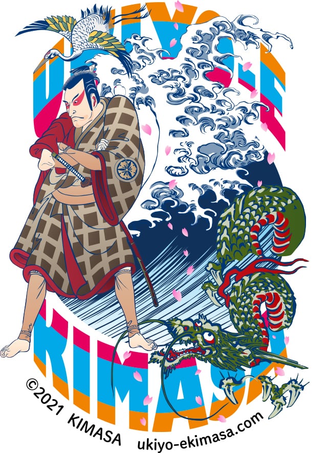 勝川春章の人物と葛飾北斎の波と歌川国芳の龍をコラージュ