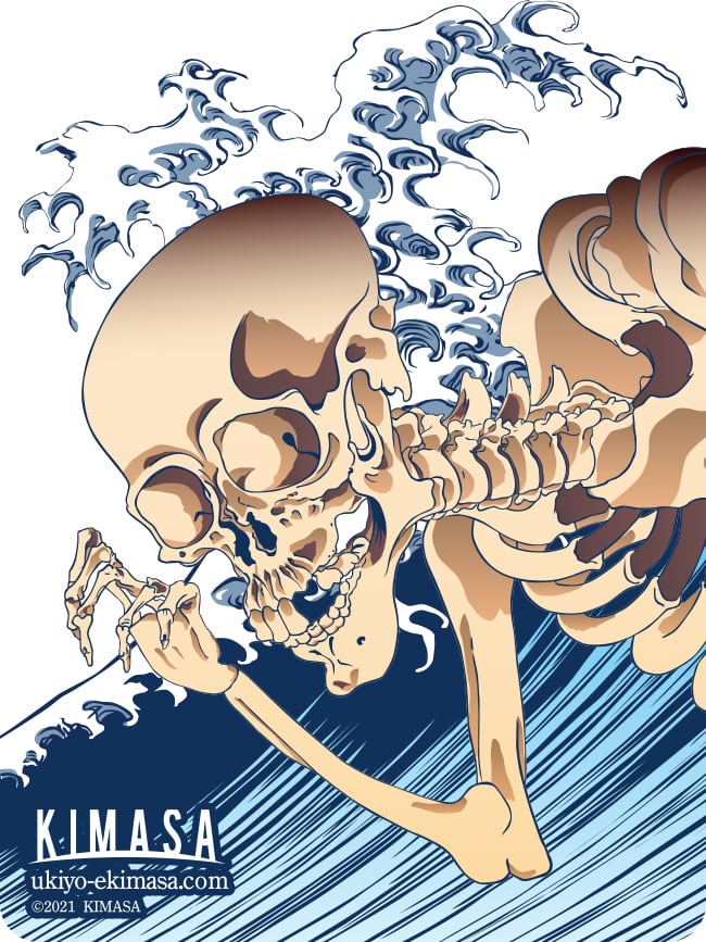歌川国芳の相馬の古内裏のどくろと葛飾北斎の波をコラージュし、迫力のあるデザインに仕上げました。