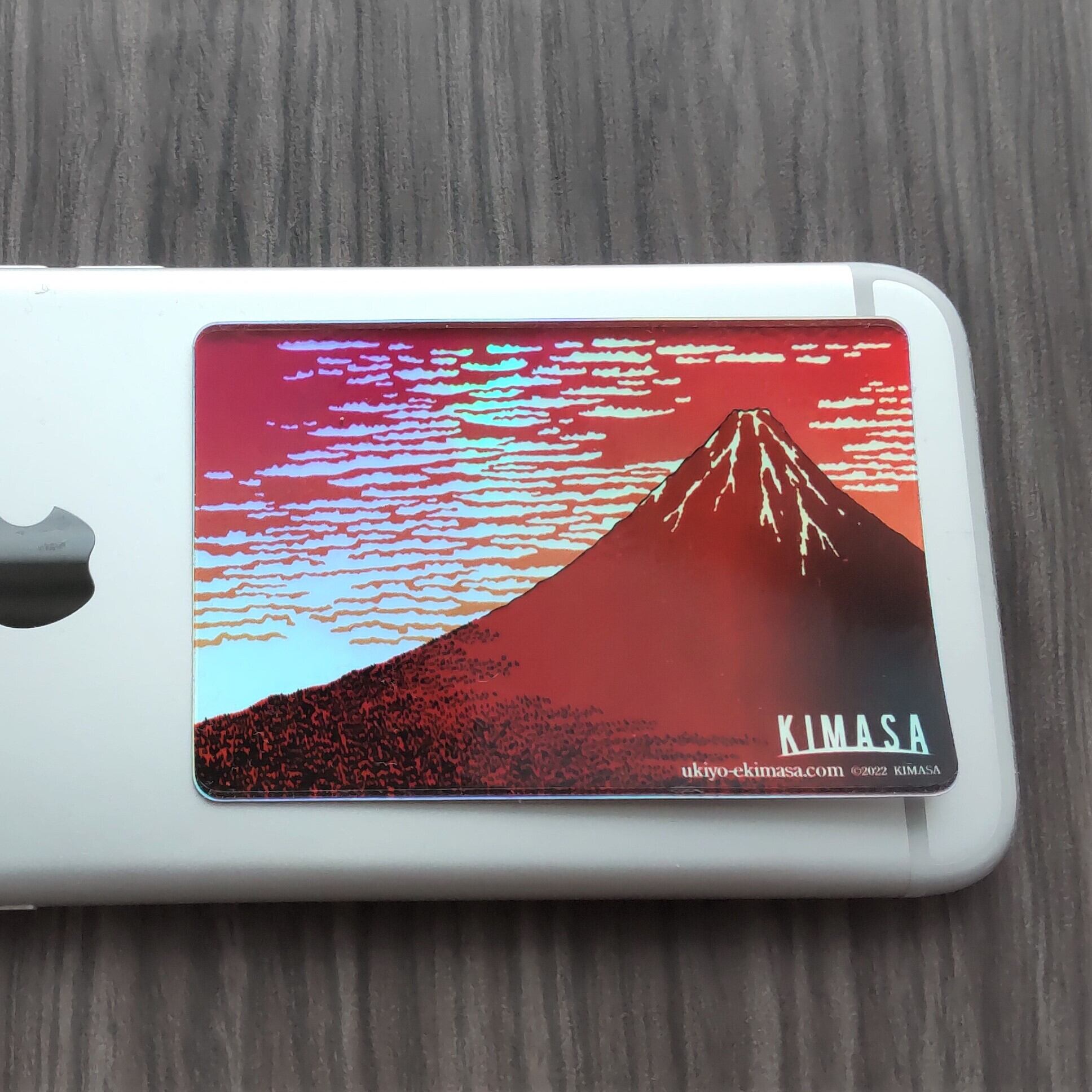 浮世絵の富士山を赤色にアレンジして、色鮮やかでキラキラのステッカーにしました。